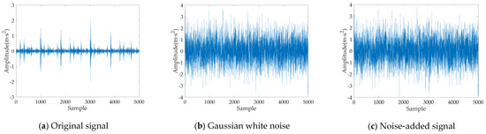 The larger the value of SNR, the smaller the noise contained in the vibration signals. SNR is inversely proportional to the amount of noise in the vibration signals. For example, we added Gaussian white noise with SNR = 0 dB to the vibration signal labeled IR014, collected from the inner ring with a fault diameter of 0.36 mm. The raw vibration signal, Gaussian white noise and noise-added signal are plotted in Figure 11a–c, while the grayscale images before and after adding noise are shown in Figure 12a–b, respectively.