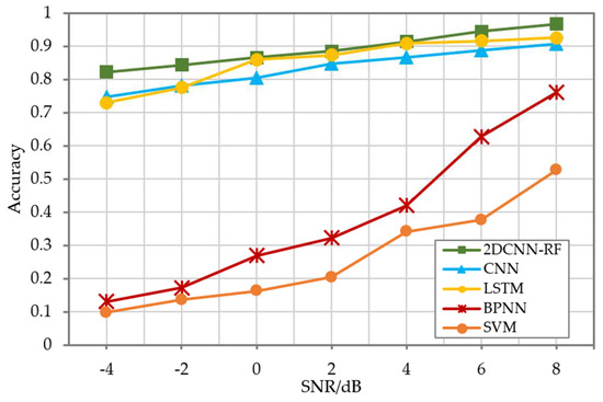 Different noise levels were tested by adding Gaussian white noises with SNR ranging from −4 dB to 8 dB to the original datasets described in Table 1. Then, the noise−added grayscale images and vibration signals were used as the input of 2DCNN−RF, standard CNN, LSTM, BPNN and SVM, so that their noise-resistive fault-diagnosis performance could be evaluated and compared. Figure 13 shows the fault-diagnosis accuracy of the five fault-diagnosis models. In comparison with Figure 9, Figure 13 shows that the fault-detection accuracy was reduced for all fault−diagnosis methods by introducing the additional measurement noises, which means a high noise level will pose a risk of fault-detection failure. Moreover, it can be observed that the fault-diagnosis accuracy will decrease with increasing noise intensity for all methods, and the noise impact on machine-learning methods is more significant than that of deep-learning methods. Still, the proposed 2DCNN−RF has better accuracy than the other four models. Under noise condition SNR = −4dB, the diagnostic accuracy of the 2DCNN−RF model still reaches 80.26%, which is 5% higher than that of the standard CNN and LSTM models. The accuracy of machine learning methods, namely BPNN and SVM, is only about 10%. These evaluation results demonstrate that the proposed 2DCNN-RF fault-diagnosis strategy is more robust against noise pollution for high-speed bearing-vibration signals.