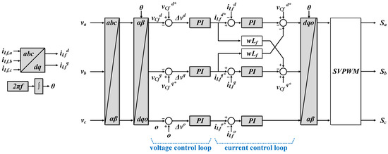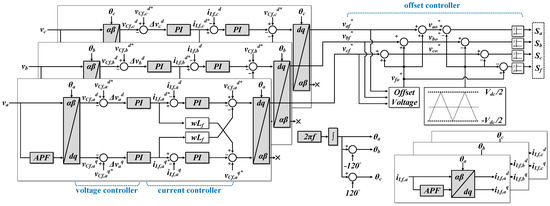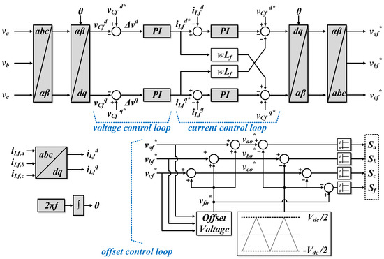 On the other hand, voltage errors are calculated from the dq components of each phase voltage considering reference voltages; they create reference currents with the PI voltage controller. Additionally, current errors are calculated from each measured phase current considering reference currents, and then they create each phase current with the PI current controller. Phase currents are compared with reference currents, and then are delivered to the SPWM through the dq-αβ transformer. Therefore, the gate signals of the upper and the lower switches for each phase are integrated with the SPWM output signal and the off-set control signal.
