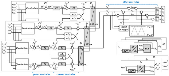 On the other hand, power errors are calculated from the dq components of the power in each phase, considering reference powers; and, then they create reference currents with the PI power controller. Additionally, current errors are calculated from each measured phase current, considering reference currents; and then they create each phase current with the PI current controller. Phase currents are compared with reference currents, and then they are delivered to the SPWM through the dq-αβ transformer. Therefore, the gate signals of the upper and the lower switches for each phase are integrated with an SPWM output signal and an off-set control signal.