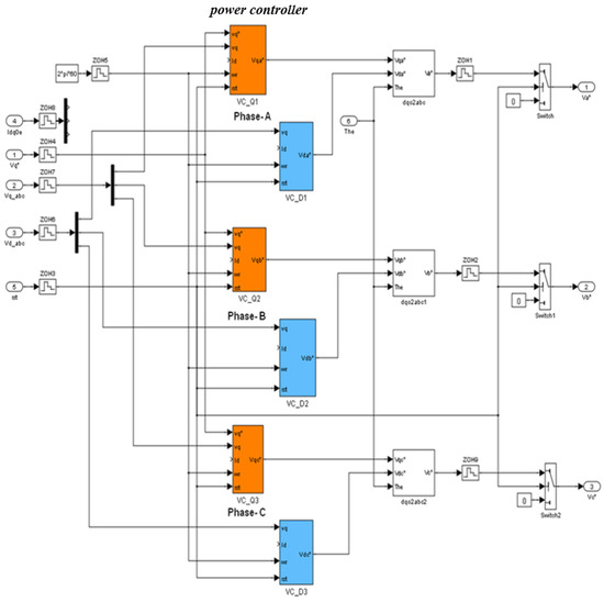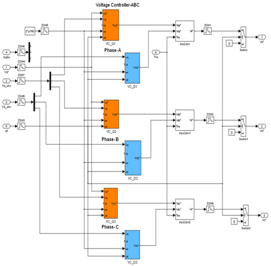 Based on the Matlab/Simulink S/W, the proposed 3-phase voltage controller using three single-phase control algorithms is represented as shown in Figure 6, where the values of vCf,a, vCf,b, and vCf,c are obtained by an inverse transform to the abc frame for the outputs of each voltage controller—vCf,xd and vCf,xq (where x is a, b, and c)—which are used as switching patterns for the 4-leg in the off-set PWM block. The analog signals of measured voltages are transformed into discrete signals using ZOH (zero order hold), as expressed in Equation (10). Therefore, by combining Equations (1), (2) and (10), the dq components of each phase voltage is transformed into discrete signals, which can be obtained as shown in Equation (11).