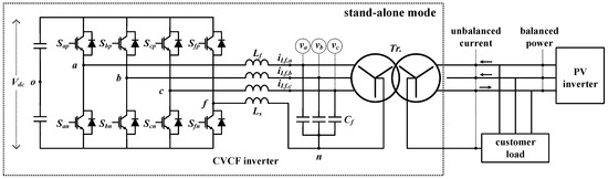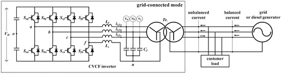 Furthermore, the customer loads in Figure 8 and Figure 9 are assumed as single-phase or 3-phase 4-wire R loads, the DC input voltage of the 4-leg CVCF inverter is 700 V, and the switching and sampling frequencies are 10 kHz, respectively. Additionally, the reference voltage of the CVCF inverter in standard mode (va, vb, vc) is assumed as 311 V, and the reference power of the CVCF inverter in grid-connected mode (Pa, Pb, Pc) is 6.2 kW. Further, the unbalanced factors of the CVCF inverter in standard mode are assumed at 42.9% and 28.6%, respectively, the unbalanced factors of the CVCF inverter in grid-connected mode is 60%, and the detailed system parameters are expressed as shown in Table 1 [21].