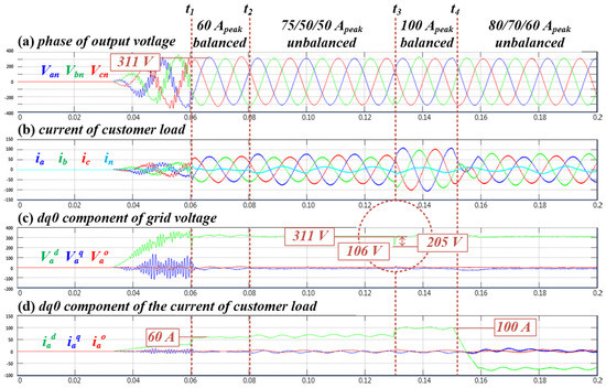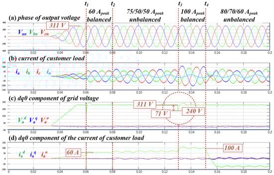 Based on the simulation conditions in Figure 8, the performances of the proposed single-phase voltage control algorithm and the conventional 3-phase dq0 control algorithm are demonstrated as shown in Figure 10 and Figure 11, where Figure 10a and Figure 11a are phases of the output voltage and Figure 10b and Figure 11b are the current of the customer load, Figure 10c and Figure 11c are the dq0 component of the grid voltage, and Figure 10d and Figure 11d are the dq0 components of the current of customer load. Additionally, as shown in Figure 11c, the d and the q components of the proposed control algorithm are properly maintained as 311 V and 0 for the 75/50/50Apeak and the 80/70/60Apeak unbalanced conditions, respectively. Therefore, this paper assumes four different operation conditions, which are 60Apeak balanced load, 75/50/50Apeak unbalanced load, 100Apeak balanced load, and 80/70/60Apeak unbalanced condition, as shown in Figure 10 and Figure 11. As shown in Figure 10, the 3-phase grid voltages of the conventional 3-phase dq0 control algorithm are maintained in a stable manner for the 75/50/50Apeak and the 80/70/60Apeak unbalanced condition, but the values of the d component at each phase voltage drop significantly to 106 V at t3 time interval.