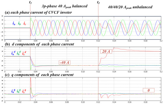 Based on the simulation conditions in Figure 9, the performances of the proposed single-phase power control algorithm are demonstrated as shown in Figure 12, where Figure 12a is each phase current of the CVCF inverter, Figure 12b is the d-component of each phase current, and Figure 12c is the q-component of each phase current. Additionally, this paper adapts two different operation scenarios, which are the −40Apeak balanced load and the −40/−40/20Apeak unbalanced load, as shown in Figure 12. From the simulation results, it is clear that the d-components of each phase current are controlled from −40/−40/−40Apeak to −40/−40/20Apeak, as shown in Figure 12b; and, the q-components of each phase current are maintained at 0, as shown in Figure 12c. Therefore, it is confirmed that 3-phase currents of the proposed single-phase power control algorithm are controlled in a stable manner under extremely unbalanced conditions.