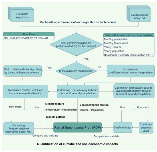 In contrast to previous studies based on the distributional approach and data modeling, we adopted a randomized [] or data-driven approach based on algorithm modeling []. We built models that can estimate the total, rural, and urban REC in Tibet by testing the datasets with eight algorithms and select the one with best baseline performance to tune. We compared the results of these models using a new model-agnostic interpretation method to reveal the individual effects of temperature and precipitation on the REC and how the urban–rural disparity influences the effect of climate on the REC in Tibet (Figure 1).