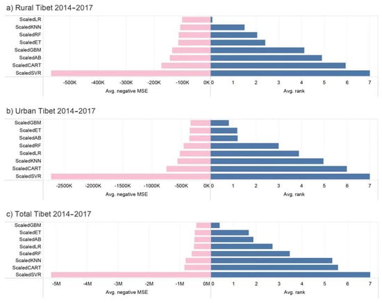 Algorithm baseline performance using the rural (a), urban (b), and total (c) Tibet datasets. Negative MSEs of different algorithms for different data are shown in pink and their average ranking for the 100 runs is shown in blue. The shorter the combination of the two bars, the better the performance of a given algorithm. GBM, gradient boosting machine; ET, extra trees; KNN, k-nearest neighbors; AB, adaptive boosting; RF, random forest; CART, classification and regression tree; SVR, support vector regression; LR-simple linear regression model, i.e., ordinary least squares (OLS) model.
