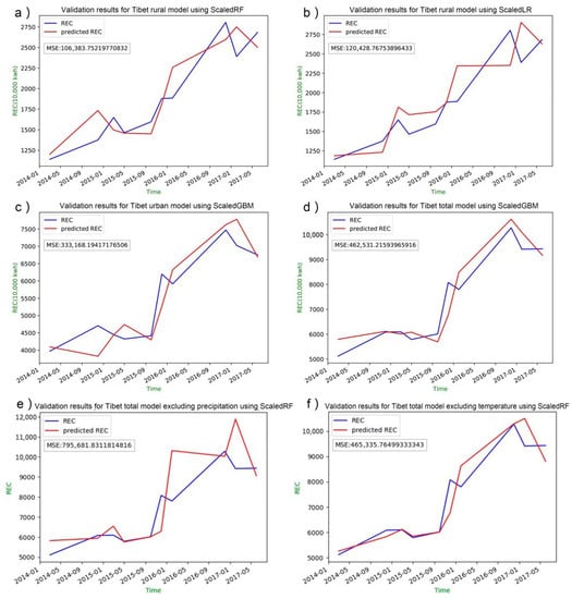 Model validation results. Plots (a–d) show the model validation results of the tree-based rural model, linear rural model, urban model, and total model for Tibet. Plots (e,f) show the results of the model trained without precipitation and without temperature, respectively. The red curves represent the REC estimates made based on the model and the blue curves show the validation REC data. MSE, mean squared error.