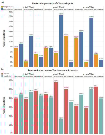 It is noteworthy that the rural cold-season model registered the highest FIS across the board with income contributing ~57.68% to its estimation, suggesting rural Tibet REC during the cold season is highly sensitive to income. While income is the more important socioeconomic factor than population across all the rural models (Figure 4), population is found to be more important (FIS~43.55%, FIS~49.82%) than income (FIS~31.39%, FIS~28.82%) for urban year-round and cold-season models (Figure 4).