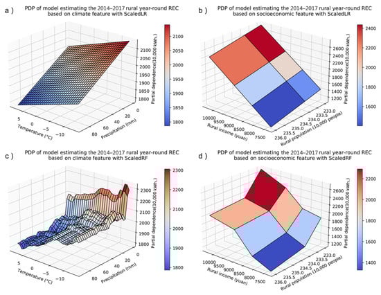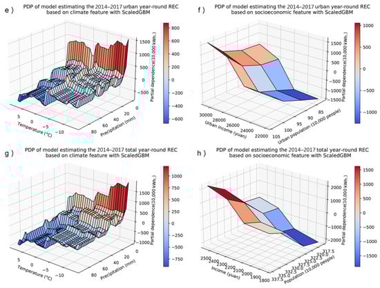 The FIS did not reveal how the features affect the REC; therefore, PDP interpretation was used. However, tree-based models were also challenged by multicollinearity regarding the PDP interpretation. The strong correlation between the temperature and precipitation prevented the quantification of their individual impacts using PDP. Thus, we quantified their joint effect—combined effect of temperature and precipitation or climate effect—by inserting tuples into and in Equation (1). More specifically, we divided the input features in two groups; namely, a climate group Cl comprising temperature and precipitation, and a socioeconomic group (Sc) comprising income and population, to accommodate the assumption for PDP that and in Equation (6) are not correlated: