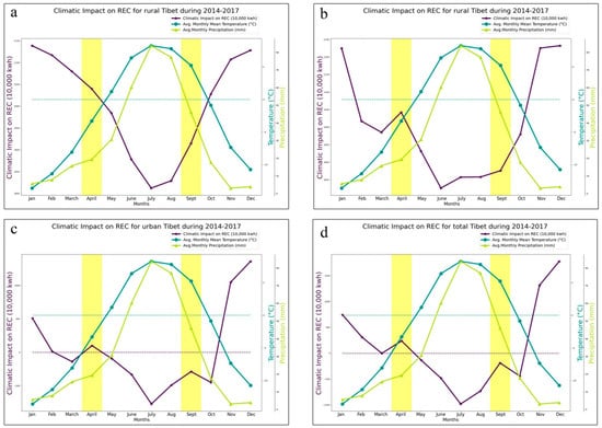 Effect of the climate on the REC in rural, urban, and total Tibet. All plots show the marginal effect of the climate feature in the respective model (purple curve). The temperature and precipitation averaged by the calendar month are represented by blue and green curves, respectively. Plots (a–d) show the results of the linear rural model, tree-based rural model, urban model, and total model, respectively.