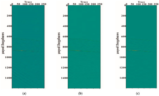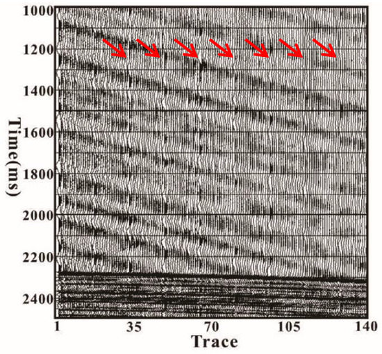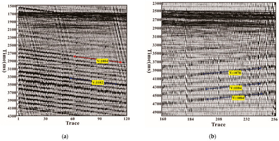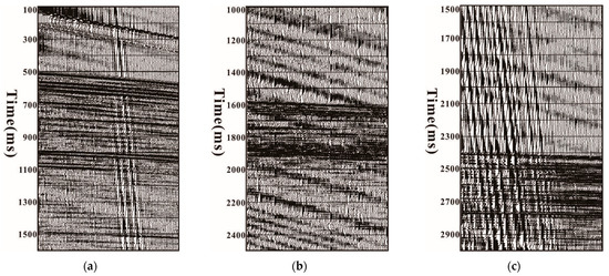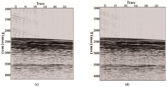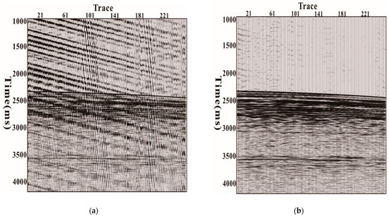 After further analysis of the data, it was found that linear noise appeared from the shooting end to the receiving end and from the receiving end to the shooting end, as shown in Figure 4a,b. The two kinds of linear noises have the same morphology and similar velocities, about 1080 m/s, only opposite in direction. Therefore, it is speculated that these two linear noises were caused by the vibration of the ship and the vibration of the tail buoy, respectively. The ship vibrated while moving, and the buoys on the stern vibrated together. These vibrations were quite regular. The vibration of the ship caused linear noise from the shooting end to the receiving end, and in contrast, the vibration of the buoy caused linear noise from the receiving end to the shooting end.