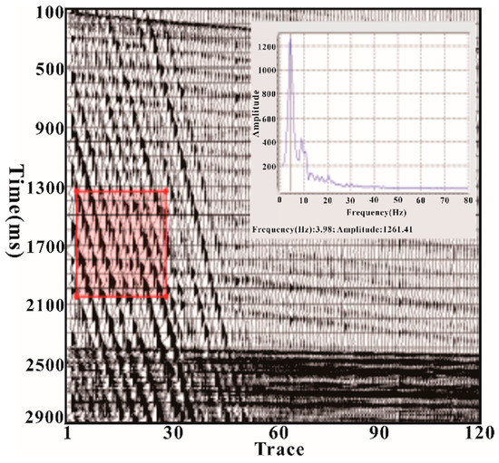 Another common noise in marine seismic exploration is surge wave noise, which has low frequency, strong energy, and randomness. In conventional surge noise, the dominant frequency of the surge is 3 Hz. As shown in Figure 3, the frequency spectrum analysis of surge wave noise shows that the dominant frequency is around 4 Hz, with a speed of about 34 m/s.