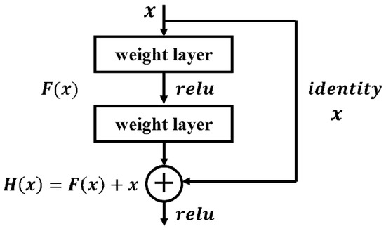 The idea of a ResNet network mainly lies in identity mapping [22]. Identity mapping is added to the network; that is, the input is added to the output layer. Experiments had found that this operation will not increase the error of a training set when the network depth is increasing [23]. However, it is difficult to learn identity mapping directly in deep network, so He et al. proposed the idea of residual learning. Figure 5 is a schematic diagram of a residual block. Assuming that x is the input and H(x) is the identity mapping that requires to solved, F(x) = H(x) − x is the residual, solving the residual function F(x) as the objective. Then, the input x is directly added to the output layer, so the H(x) can be expressed as H(x) = F(x) + x. In this case, H(x) is obtained by summing the two components; the benefit of doing this is that when the network has reached the optimum, continuing to deepen the network, F(x) will be set to zero, so H(x) = x, which means the network will always remain optimal, and the performance of the network will not degrade as the number of layers increases. Meanwhile, in the process of back propagation, the gradient is transmitted between the two residual blocks, and the gradient before the derivation is added, which is equivalent to increasing the gradient artificially and reducing the possibility of gradient disappearance [24].