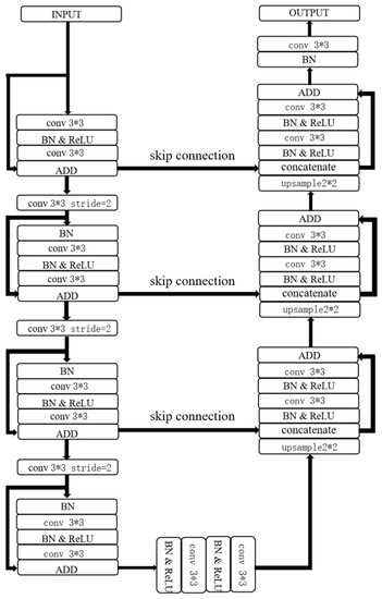 Based on the analysis of noise in the data and the characteristics of ResUNet, the structure of the ResUNet network constructed in this paper is shown in Figure 6.