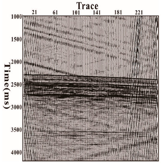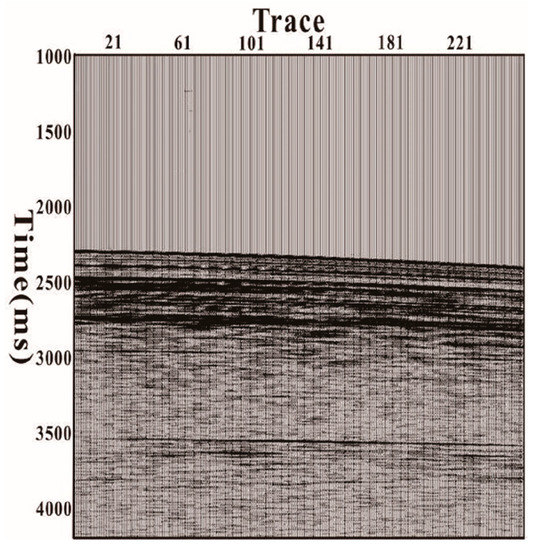 The data used in this study were collected by a ship named “Tan Bao Hao”. The hardware collection system was developed by Beijing Appsoft Technology Co., Ltd., Beijing, China. The acquisition parameters were as follows. The source used in this acquisition was an air gun source: the shot points were 5 m below the sea surface, and the shot spacing was 25 m. The channel spacing was 3.125 m, and there was only one hydrophone per channel. The number of traces in one shot gather was 256, and the time sampling interval was 0.25 ms; the total record length was 7 s, so there were 28,000 sampling points per trace.