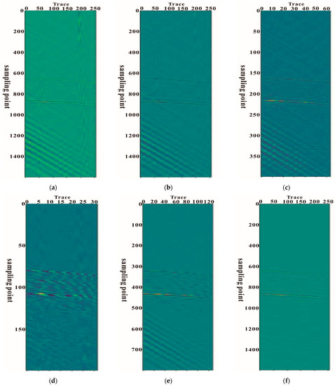 Figure 13a–f are the output of some intermediate layers in the last training epoch. In the process of down-sampling, the input data with a size of 256 × 1600 are compressed into 32 × 200 abstract features to obtain data of different scales, and the resolution of the image continuously reduces. Meanwhile, the number of feature maps gradually increases. The process of up-sampling is mainly used to recover target details; the feature maps extracted from the down-sampling are combined with the reconstructed information from the up-sampling by skip connection to shorten the time of network training [26]. Then, this is compared with the label data in the output layer, the error is calculated, and back propagation is performed.