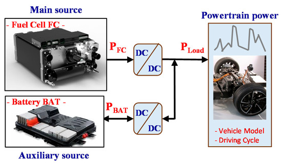 To illustrate the performance of our new design approach, we used a parallel hybrid fuel cell/battery source with a DC/DC converter for each source, which is one of the most promising solutions for HEV. This architecture is commonly used in the literature for its numerous freedom degrees that allow a wide range of EMS optimization [30]. Figure 1 presents this architecture, with the FC considered as the main energy source and the battery as the auxiliary power/energy source. The city car Renault ZOE was used for the vehicle specifications model (weight, surface, etc.) to evaluate the power cycle of the FCEV demand according to different normalized speed cycles (WLTC, US 06, US Highway, etc.).