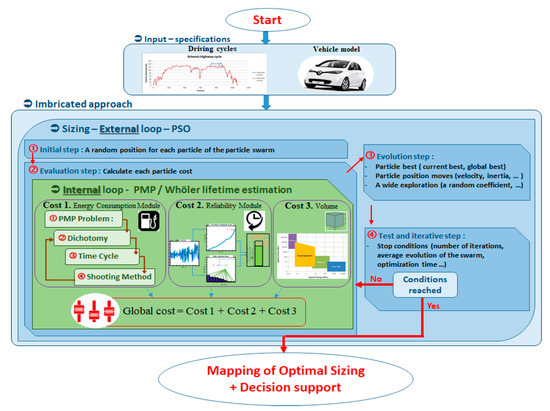 For simultaneous paradigms, the process realizes both optimizations (sizing and control) using the same formulation. With this approach, the performances are better due to the ability to realize parallel calculations, but it creates more complexity for interdependence problems (formulation, computation time). On the other hand, imbricated ones (coupled optimization) allow the possibility of making a simple and performant implementation. We already suggested a new imbricated approach for hybrid system design with large search space ability [18]. This proposed methodology simultaneously designs and tunes the component sizing and energy management by optimizing several parameters (power, capacity, and response time of the sources) according to the specifications. Two imbricated loops are used to implement this approach, the particle swarm optimization (PSO) for system sizing and the Pontryagin optimal control algorithm (PMP Pontryagin’s Minimum Principle) for EMS. With this approach, we can quickly obtain an optimal solution with good accuracy and robustness, considering the large search space and the convergence ability of the global methodology.