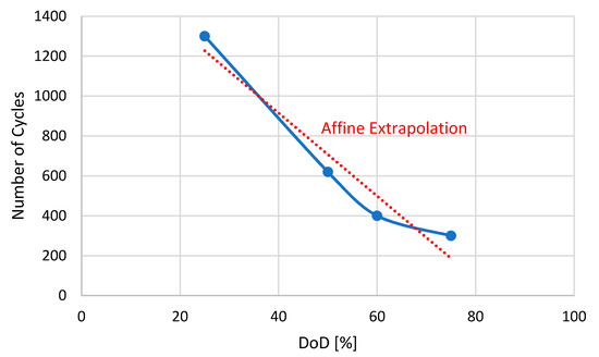 A linear trend extrapolation of BAT SOH according to DOD variation [28].