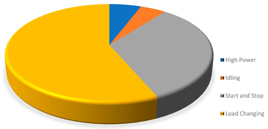 In the counting process, we realize a cumulative addition of each second of the cycle during which the FC is used at the considered condition (Figure 11). For the power rate, each second (Xi) of the cycle pondered by the power rate (Pi) is counted (1 s is counted as 1 when the FC is at 100% of power and counted as 0.5 s when the FC is at 50% of power). For the load changes, each second (Yi) is counted when the FC realizes a load change and is not counted when the FC is at constant load.