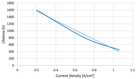 We can see that for a constant power supplied by the FC, the SOH evolves almost linearly in a proportional way considering the rated power. We use the same approach presented in the previous section, based on the Whöler approach, to create a qualitative lifetime assessment. It considers the aging behavior of linear PEMFC regarding the power rate (Figure 8).