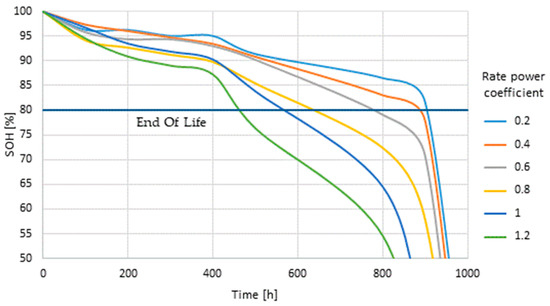 For the first mechanism [51,52,53,54,55], the experimental studies based on accelerated results shown in Figure 7 reveal the evolution of the SOH for different power supplied at a constant rate.