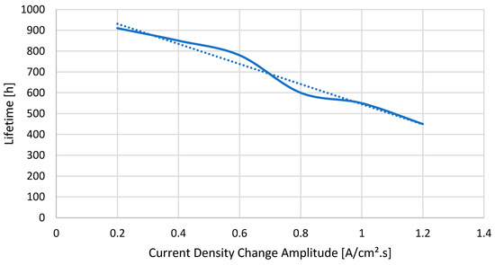 The second aging process is led by load change amplitude in the FC use; we proceeded, in the same way, looking for experimental accelerated results (Figure 9) of SOH estimation according to load change amplitude [51,52,53,54,55].