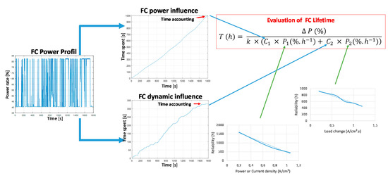 The FC lifetime assessment module uses a mathematic formulation based on the power rate and load change aging models and some accounting of the time spent in each aging situation [54]. It allows a simple methodology, compatible with the BAT reliability estimation, for assessing the effect of the energy management strategy on the FC lifetime (Figure 11). This model can be presented in the following mathematic formulation (Equations (7)–(9)):
