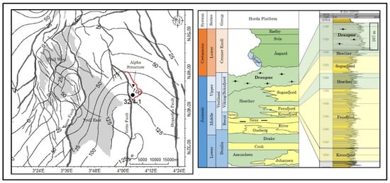 Location map of the Horda Platform, the northern North Sea showing the major and minor faults with Troll fields as reference. The contour lines represent the Draupne Formation thickness adapted from [15]. The red polygon against the Vette fault is the Alpha prospect (left). A generalized stratigraphic succession of the Horda Platform showing the Jurassic and Lower Cretaceous formations and the vertical distribution of the Upper Jurassic reservoir-caprock configuration is shown in well 32/4-1 (right) (adapted from [16]).