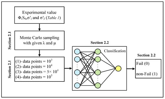 This section discusses the theoretical principles in detail. Section 2.1 describes the Monte Carlo sampling algorithm based on the given mean value and standard deviation. Section 2.2 delves further into the concepts of machine learning and neural network for binary classification. The study’s workflow is depicted in Figure 2.