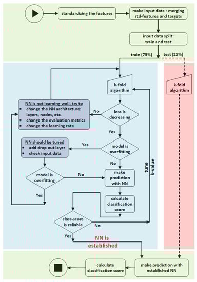 The flowchart illustrates establishing a NN using train data set and then validating the network with test data set.