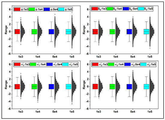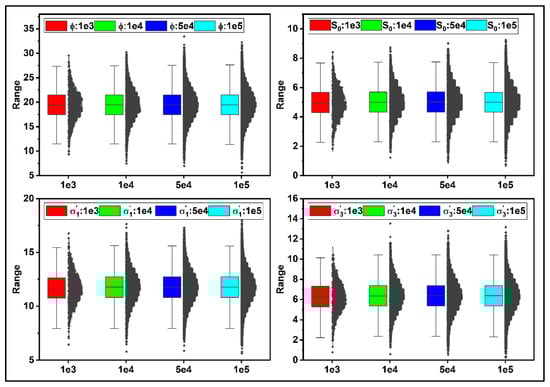 Figure 6 represents the probability distribution function (PDF) of ϕ, S0, σ’1, and σ’3 for different sample sizes. As seen, the PDF diagram behaves identically for various sample sizes, even though the depicted ranges vary by sample size. In other words, regardless of sample size, the mean value and standard deviation of each curve shown in Figure 6 are the same as those given in Table 1.