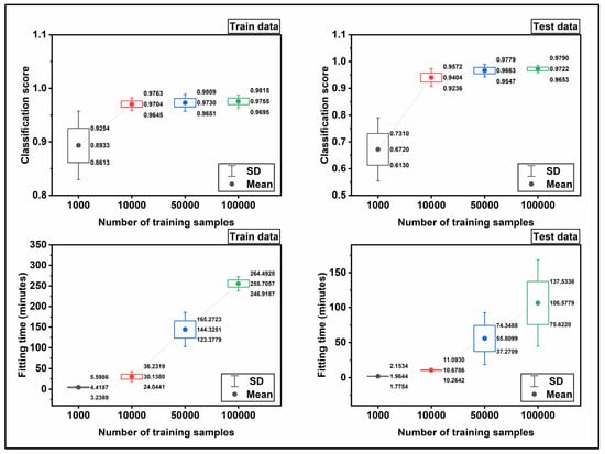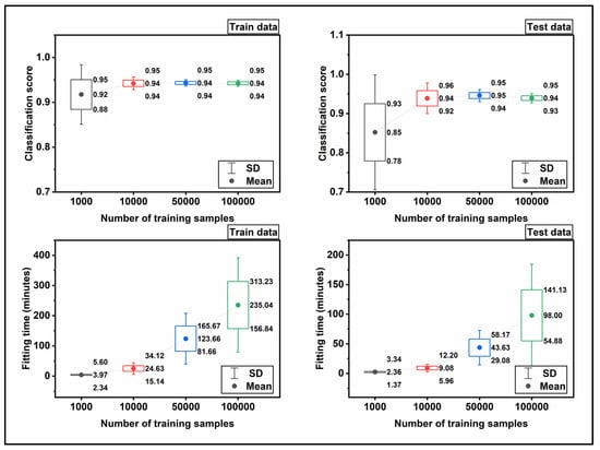 Figure 10 displays the trend of the classification scores and fitting time for the train and test datasets. The mean values and standard deviations were plotted with filled circles and error bars, respectively. The classification scores in Figure 10 were calculated based on the fraction mentioned above. Namely, to calculate the mean value for the classification score, the score is averaged for 10-fold cross-validation, and the relevant standard deviation was determined simultaneously. As observed, the classification score for train and test data increases when the size of the input data increases. To be specific, from 1000 to 10,000 a sever slope is observed in classification score while the trend stabilizes approximately after 50,000 to 100,000. For train data, the mean score starts with 0.89 for the 1e+03 input data and reaches 0.98 for the 1e+05 input data. The same trend is observed for test data, and the main difference is the kick of score for the 1e+03 data, which is 0.67. The fitting time is depicted in Figure 9, is also averaged over 10-fold cross-validation. As seen, the fitting time increases by increasing the size of the input data.