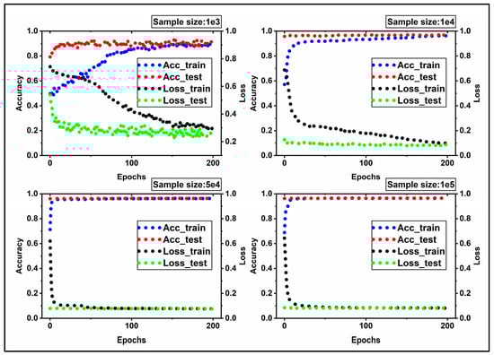 Figure 9 shows the trend of accuracy and loss functions for train and test datasets. The ascending and descending profile for accuracy and loss in Figure 9 shows the NN learns appropriately. However, the distinct behavior of NN with various input datasets produced a unique pattern for each input data size. Although the input datasets after scaling have a mean value of zero and a standard deviation of 1, they differ in size. In Figure 9, the blue and red circles depict the accuracy profile for train and test data sets, respectively, while the black and green circles depict the loss function profile for train and test data sets. When epochs = 160, the loss function of train data stabilizes at about 0.2 for input data of size 1e+03, whereas the trend for 1e+04 first declines and eventually stabilizes around 0.1 when epochs = 200. When the size reaches 5e+04 and 1e+05, the loss profile significantly decreases and stabilizes around 0.07 and 0.06, respectively. Simultaneously, the accuracy trends increase significantly and settle at 0.99. In comparison to 5e+04 and 1e+05, inputs of size 1e+03 and 1e+04 provide less accuracy. In other words, shifting from 1e+03 data to 1e+04, 5e+04, and 1e+05 data improves convergence conditions, resulting in higher accuracy and smaller loss. He et al. [32] also, had reported a larger sample size leads to a higher accuracy. The accuracy and loss profiles for test data sets, including all available data sizes, exhibit more favorable convergence conditions than train data sets.