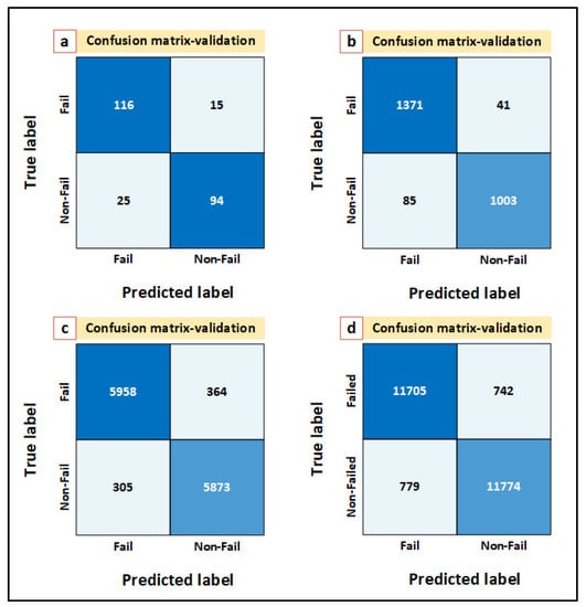 In order to validate the NN model, it is necessary to feed the model with an unseen data and assess the outcomes. To that end, unseen data points of 250, 2500, 12,500 and 25,000 are introduced into the NN model. The validation results for 250, 2500, 12,500, and 25,000 unseen data are shown in Figure 11a–d.