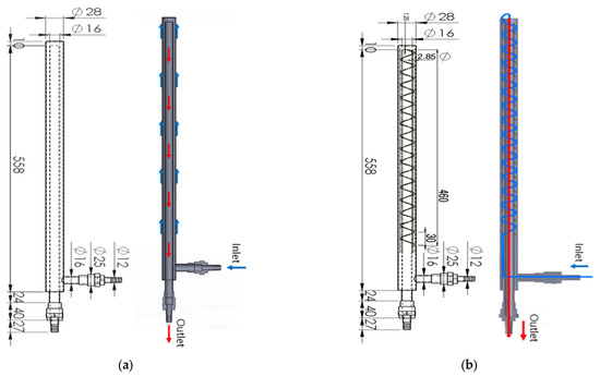 For the comparison purpose, the dimension details were taken similar to the existing absorber tube. However, the changes occur inside the absorber tube by adding the copper coil between the inner and outer tubes. According to the convection heat transfer as presented in Equation (1), the rate of heat transfer (Q) will get high by enlarging the absorber surface area (A) that is in contact with the working fluid [22,23]. Due to its resistance to corrosion and high thermal conductivity, the coil was made from copper. Details of coil-based absorber are shown in Figure 2.