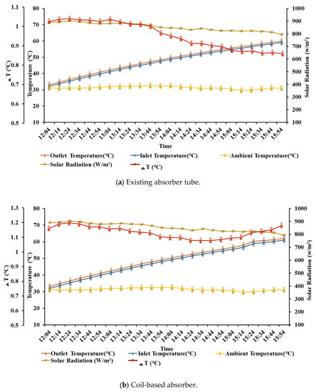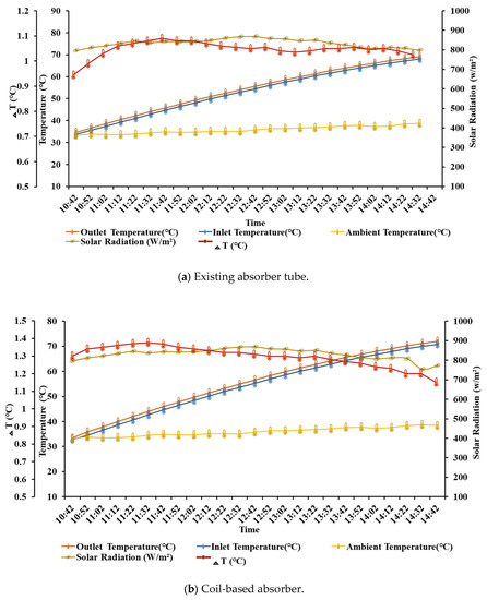 The thermal efficiency of the conical concentrating system was compared with and without coil-based absorbers under similar weather conditions. For the reference case, the solar collector performance was investigated with an existing absorber (without coil) and distilled water was used as a heating medium at flow rate 6 L/min. Under clear sky conditions, the time-based data of solar radiation, wind speed, and temperature were collected between 12:06 p.m. and 3:54 p.m. on 5 June 2020. The average values of solar radiation and ambient air temperature were found to be 853.69 W/m2 and 30.71 °C, respectively, and the wind speed varied in the range of 1.2–1.8 m/s. The solar radiation, water, and air temperatures were measured every minute and averaged over 10 min’ intervals. For the existing absorber tube, the inlet and outlet temperatures of working fluids were varied in the range of 32.09–59.06 °C and 33.32–59.94 °C, respectively. While for the coil-based absorber, the inlet and outlet temperatures of working fluids were varied in the range of 31.97–60.91 °C and 33.13–62.09 °C, respectively, as shown in Figure 3.
