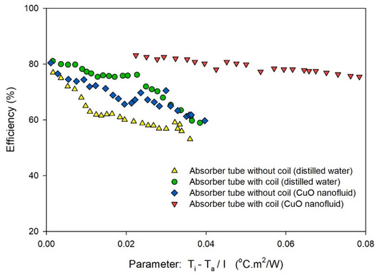 It can be observed that there is a good correlation between instantaneous efficiency and (Ti − Tα)/I parameter at fixed flow rates of 6 L/min both in cases of existing absorber tube and coil-based absorber. In the case of the existing absorber tube, the average efficiency of the collector increased by 60.1~72.2% with distilled water. The reason for this increase in efficiency at fixed flow rate is due to the elongation of interaction time between the inner absorber surface and the fluid, which is important to an increase in circulating fluid temperature. The high-water temperature leads to more heat loss from the absorber surface than ambient temperature. While using CuO nanofluid in the existing absorber tube, it was found that minimum, average and maximum values of efficiencies were found to be 59.7%, 68.4%, and 80.45%, respectively. Therefore, on an average, using nanofluid, the efficiency of existing absorber tube was found to be 12% more than in the case of using distilled water. On the other side, using the coil-based absorber, the average heat collection efficiency was found to be 68.4% and 79.1% in the case of using distilled water and nanofluid, respectively. Similar to the existing absorber tube case, use of nanofluid gave better efficiency than that of distilled water. Comparing the existing and coil-based absorber, it can be observed that the coil-based absorber showed a 10.7% higher thermal efficiency than that of conventional absorber. It can be explained by the fact that the addition of coil inside the absorber has not only increased the retention time for the exchange of heat between the circulating fluid and the absorber surface, but also enhanced the overall heat transfer area, which ultimately resulted in an enormous thermal gain. This shows that a coil-based absorber using nanofluid as heating medium is good option for better thermal efficiency. It is important to note that the data for each case was taken from different days; therefore, the climatic conditions are different on each day. The inflection at 0.022 °C.m2/W point may be the result of abnormal variations of solar radiation in that span of time.