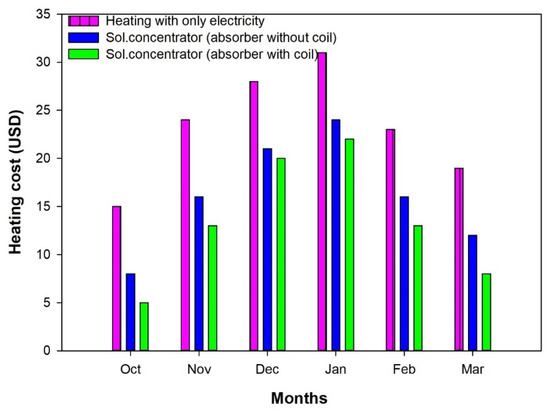 Figure 6 shows six months heating cost using electricity and these two cases of solar concentrator. For the months of October and March, the ambient temperature is normally higher than December and January (colder), so cost of electricity is lower and solar concentrator also perform well due to better availability of solar radiations. However, the heating cost due to electricity increased in colder months dye to drop in ambient temperature and existence of more cloudy days. The contribution of the solar absorber with both of its cases (with and without coil) in reducing heating cost is evident. Therefore, economically, it would be the suitable option for space heating, especially in remote areas where the grid supply is limited or nonexistent due to high price of transmission and distribution infrastructure.