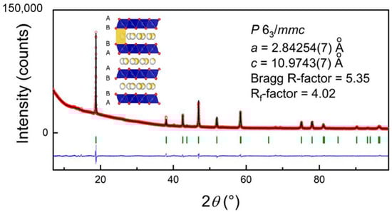 Na0.8Co0.8Ti0.2O2 was prepared as a single-phase material, the corresponding diffraction pattern and structural information are presented in Figure 1 and Table 1. Rietveld analysis of the structural model based on the β-RbScO2 structure (P63/mmc space group, P2-form) provided lattice parameters a = 2.84254(7) Å, c = 10.9743(7) Å, Bragg R-factor of 5.35 and Rf-factor of 4.02 with the overall temperature factor 1.88(7) Å2.