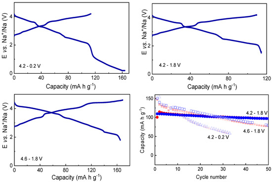 First, Na0.8Co0.8Ti0.2O2 was studied in Na-cells using a conventional electrolyte composition containing 1M NaClO4 in EC/PC (1:1) + 5% FEC. In order to find the optimal electrochemical performance, different potential windows were tested such as 4.2–1.8 V, 4.2–0.2 V and 4.6–1.8 V vs. Na+/Na, see Figure 2 for the charge–discharge curve in the first cycle, and capacities during the 50 cycles for these cell potentials. The capacity value of about 110 mAh g−1 corresponds to change in the Na-content Δx(Na) = 0.4 in Na0.8Co0.8Ti0.2O2.