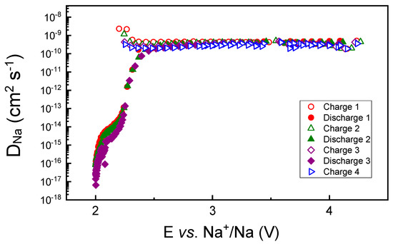 The chemical Na diffusion coefficient in Na0.8Co0.8Ti0.2O2, determined for the first several charge–discharge cycles of the material in the Na-cell, confirms a very stable Na-removal/insertion behavior (see Figure 3). It is almost constant in a potential range between 2.5 and 4.2 V and decreases significantly below 2.35 V, close to the onset of a strong potential decrease in Figure 2. The diffusion coefficient is much higher than that measured for O3-Na0.95Co0.5Ti0.5O2 of 10−14 cm2 s−1 [15], thus confirming the higher and more stable Na mobility in the P2-structure in comparison to the O3 structure.