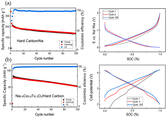 Prior to the study of full cells with the Na0.8Co0.8Ti0.2O2 cathode and hard carbon anode, hard carbon was tested in a half cell with a Na metal anode (see Figure 4a). Some capacity fade with a higher discharge capacity in comparison to the charge one occurs during first several cycles, resulting in a Coulombic efficiency lower than 100%. This is due to a solid–electrolyte interface (SEI) formation on the hard carbon surface. In the next cycles, the discharge and charge capacities are very close to each other. Comparison of the cell potential development for the 1st, 2nd and the 100th cycle shows noticeable difference between the 1st and the 2nd charge processes and almost no difference between the 2nd and 100th charge, pointing to a nearly constant battery polarization during long-term cycling. A full cell with Na0.8Co0.8Ti0.2O2 and hard carbon demonstrates some capacity fading with the cycling as well (Figure 4b). Evolution of the cell voltage with cycling shows a big difference between the first and second cell charge (Figure 4b, right), since the full cell shows almost a zero potential prior to the electrochemical measurements.