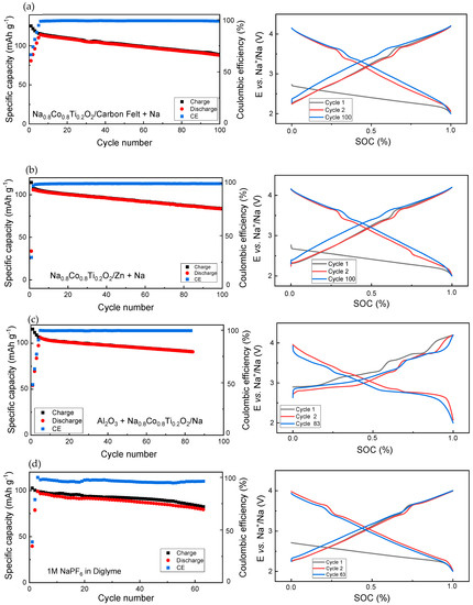 A protective Al2O3-layer was deposited on the Na0.8Co0.8Ti0.2O2 cathode, which was prepared as a coating film on the Al foil. In this strategy, the charge capacity was also significantly higher than the discharge capacity during the first several charge–discharge formation cycles. Additionally, charge and discharge curves showed several additional peaks pointing to some parasitic redox reactions, which take place in parallel to the main electrochemical reaction. Interestingly, the cell voltage during charge and discharge after 83 cycles was very close to the 2nd cycle (Figure 5c).