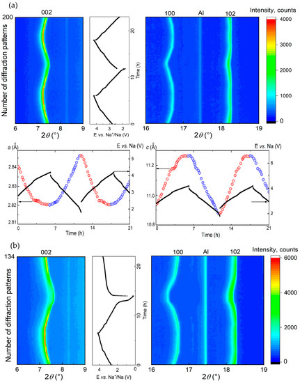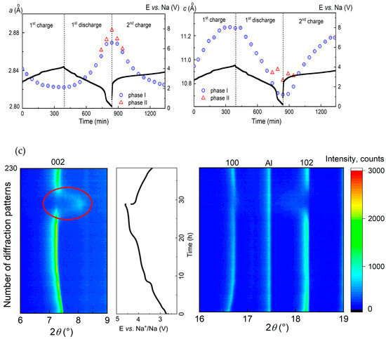 Contour plots of diffraction patterns for Na-batteries with Na0.8Co0.8Ti0.2O2, cycled in the potential range of (a) 4.2–1.8 V, (b) 4.2–0.2 V, and (c) 4.6–1.8 V vs. Na+/Na, together with the lattice parameters a and c, calculated from the Rietveld structural analysis. Due to the low crystallinity of Na0.8Co0.8Ti0.2O2 above 4.4 V because of the phase transformation, Rietveld analysis was not possible for this high potential range. The reflection at 2Theta value of 17.5° belongs to Al as a component of the electrochemical cell.