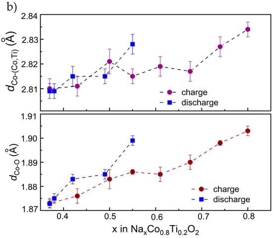 In this potential window, Ne-removal and insertion occur mostly as a single-phase reaction mechanism, as shown in the waterfall-plots of diffraction patterns (Figure 6a). No additional reflections appeared during cell charge and discharge. During cell charge, lattice parameter a decreases, reflecting the shortening of the average (Co,Ti)-O distance, while the lattice parameter c increases due to the strengthening repulsion between neighboring (Co,Ti)O2 layers upon Na-removal (Figure 6a). A change in the slope in the cell voltage vs. time at 3.5 V during cell charge coincidences with slower changes in the cell metrics of NaxCo0.8Ti0.2O2 above this potential. The kink corresponds to the composition Na0.6Co0.8Ti0.2O2 with the average oxidation state of Co + 3.25. From the XRD data, we cannot elucidate any structural differences such as a Na/vacancies ordering between the compounds with the Na-content higher and lower than 0.6. It is possible that a very narrow multi-phase region with coexistence of two NaxCo0.8Ti0.2O2 phases with tiny structural differences can exist. However, additional comprehensive structural investigations including TEM and electrode diffraction as well as neutron diffraction are necessary to confirm this suggestion.