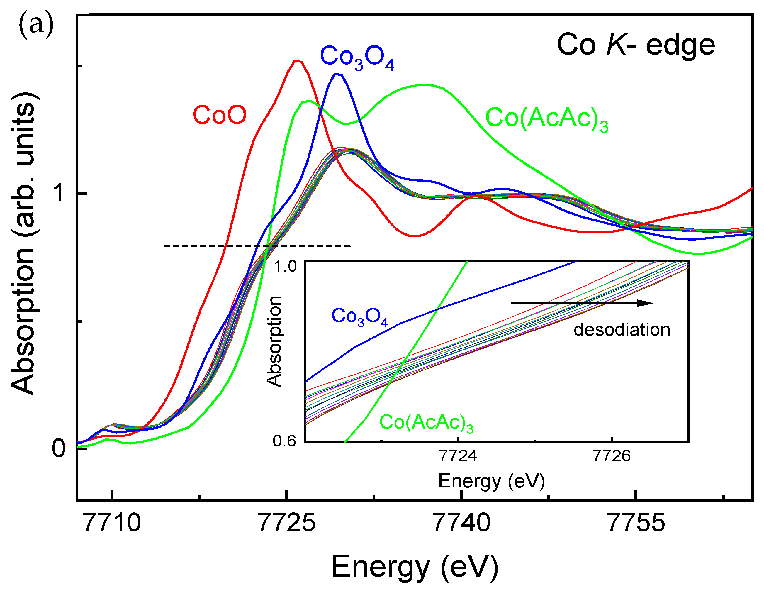 In order to understand the charge compensation mechanism during Na-removal from and insertion into Na0.8Co0.8Ti0.2O2, XANES and EXAFS measurements have been performed. For XANES analysis, K-edge spectra of CoO, Co3O4 and Co(AcAc)3 used as reference materials for Co2+, Co2.66+ and Co3+, were recorded as well (Figure 7a). The spectra show a clear shift towards higher energy values during desodiation of Na0.8Co0.8Ti0.2O2 (inset in Figure 7a), indicating the oxidation of Co ions.