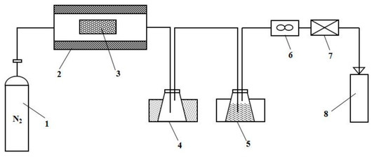 Schematic diagram of the experimental apparatus of the pyrolysis system. 1: nitrogen bottle; 2: tube furnace; 3: quartz tube; 4: condensing unit; 5: hydrogen–chloride absorption bottle; 6: gas flowmeter; 7: dryer; 8: gas bag.
