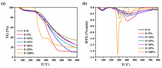 Figure 2 shows the TG and DTG curves of HLE pyrolysis with different PVC additions. The degradation process of PVC can be observed from the TG curve. The weight-loss curve of PVC shows that two peaks at the maximum value appeared at 300 °C and 450 °C. From 200 °C to 380 °C was the first step of the degradation, including the dehydrochlorination reaction. The second step of the degradation corresponded to the peak reaching a maximum at 450 °C, which was related to the carbonization process. A similar conclusion was reached in the past [22,23].
