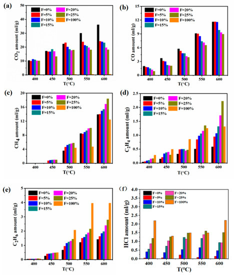 (a) CO2, (b) CO, (c) CH4, (d) C2H4, and (e) C2H6 release amount of pyrolysis with different PVC additions. (f) HCl release amount of pyrolysis with different PVC additions.
